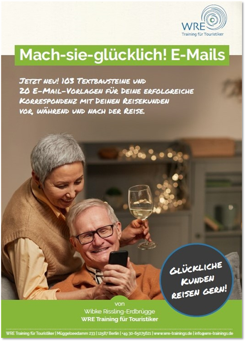 Wer positiv, herzlich und fröhlich mit seinen Reisekunden schreibt, gewinnt leicht das Vertrauen. Mit diesen 20 E-Mail-Vorlagen und 103 Textbausteinen wird es leicht, immer genau die richtigen Worte zu finden. Unsere Texterin Katrin hat mit Herzblut, Charme und guter Laune E-Mail-Vorlagen und Textbausteine entwickelt, die Deine Korrespondenz mit Deinen Reisekunden positiv, optimistisch und für Dich einfach machen.