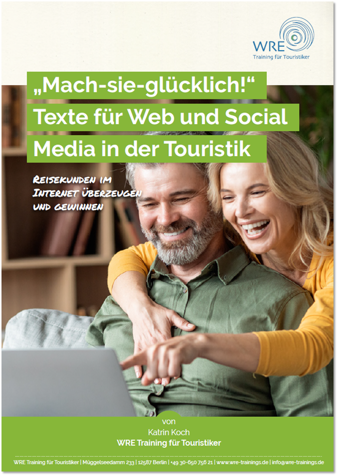 Handbuch für Deine wirkungsvollen Texte auf Euren Websites, in Euren Newslettern und auf den Social Media Kanälen. Mit 105 Textbeispielen zum Abschreiben. Wir zeigen Dir, wie Du für Eure Webseite und den Newsletter tolle Beiträge schreiben kannst und für Facebook und Instagram spannende Posts textest. Tipps und Tricks inklusive. Du erfährst auch, wie Dein Reiseunternehmen souverän mit Beschwerden im Internet umgeht,